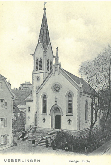 Seit 1859 gibt es in Überlingen einen ständigen evangelischen Gottesdienst. Damals wurde dieser vom Pastorationsgeistlichen Ewald von Meersburg aus gehalten. 1861wurde sein Sitz von Meersburg nach Überlingen verlegt. 1863 wurde das alte Pfarrhaus, die ehemalige Klosterkirche des Franziskanerinnenklosters, gekauft. Direkt daneben wurde 1866 der Grundstein zum Bau der Auferstehungskirche gelegt. 1867 konnte sie am 30. Juli eingeweiht werden. Im selben Jahr wurde die Ev. Genossenschaft zur Kirchengemeinde erhoben. 1903 war die Kirche bereits zu klein und musste erweitert werden. Der Bau eines Turmes und die Anschaffung von Glocken wurden beschlossen. 1877 wurde das alte Pfarrhaus vermietet, als Pfr. Ewald ein eigenes Haus am See errichtete. Dieses wurde 1908 von der Kirchen-gemeinde als Pfarr- und Wohnhaus erworben und Anfang der 90er Jahre zum Gemeinde- und Pfarrhaus umgebaut.